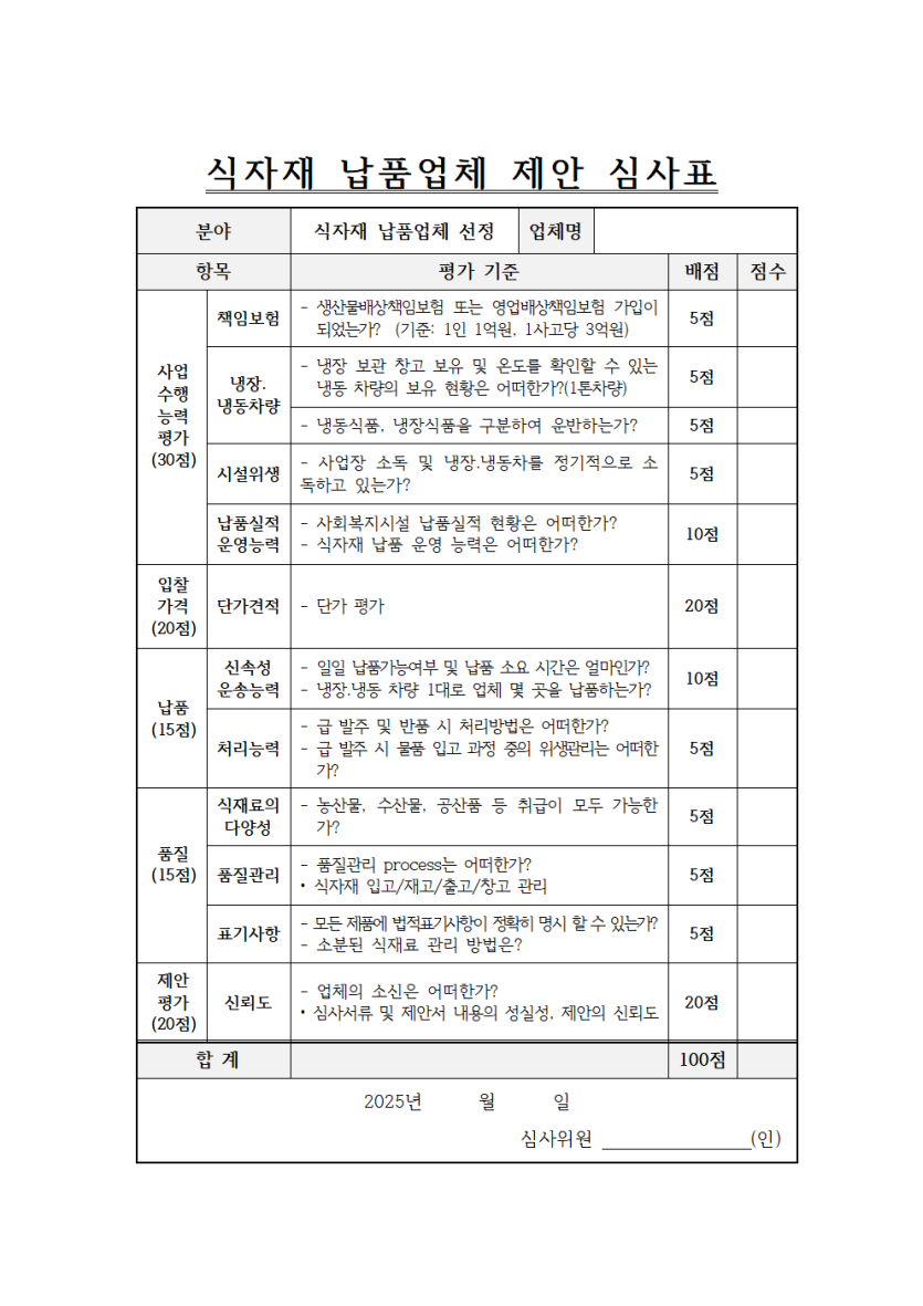 2025년도 식자재 납품업체 선정 제안 설명회 개최 공고