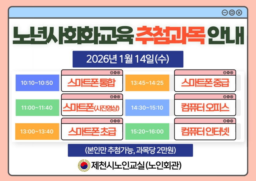 2026년 노년사회화교육 프로그램 추첨안내 [1월14(수)~16(금)]