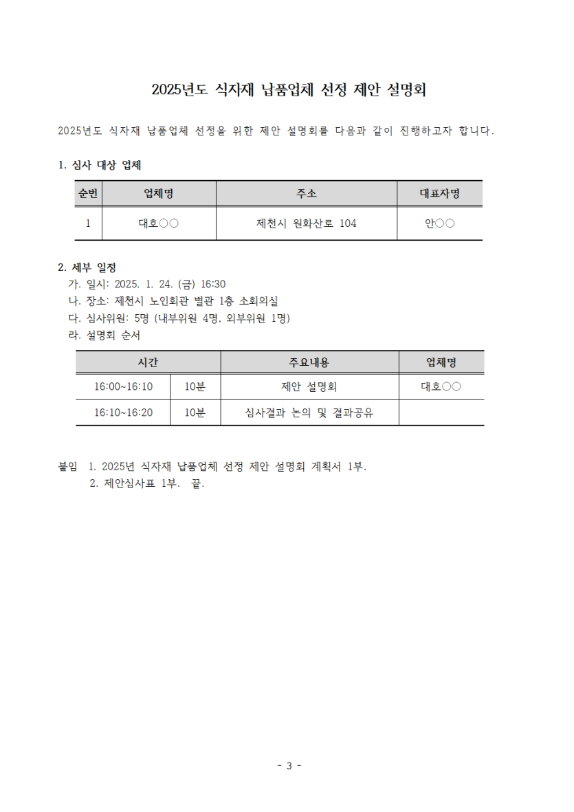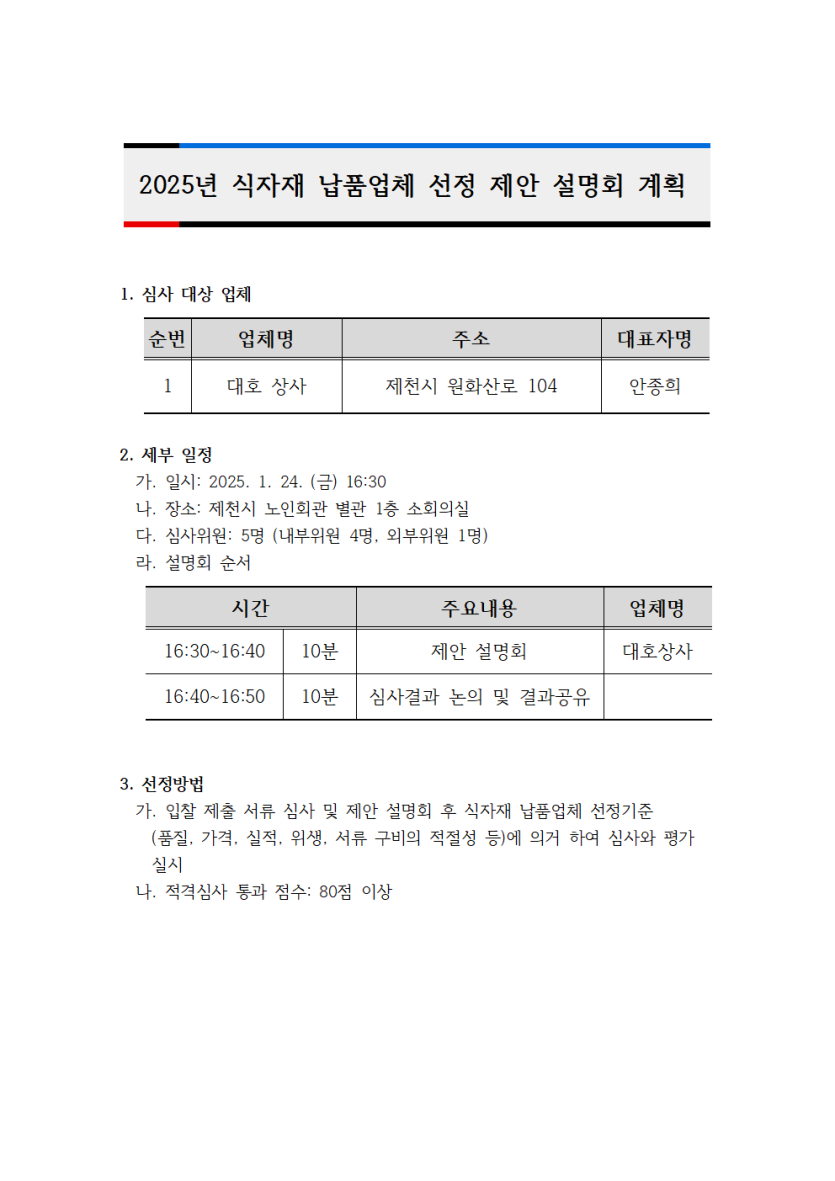 2025년도 식자재 납품업체 선정 제안 설명회를 아래와 같이 진행하고자 합니다.