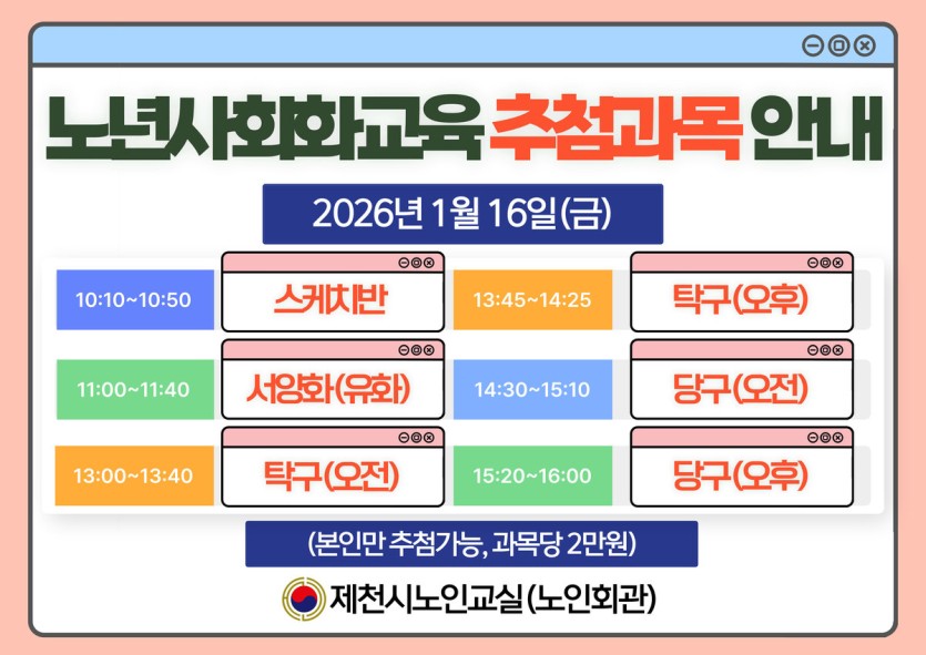 2026년 노년사회화교육 프로그램 추첨안내 [1월14(수)~16(금)]